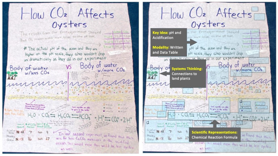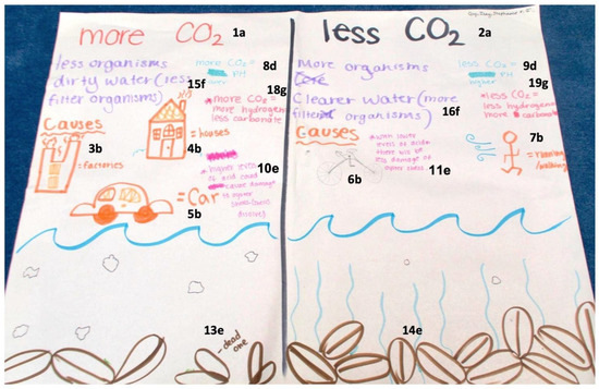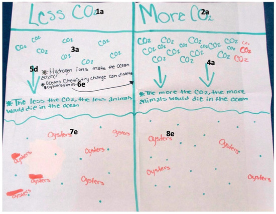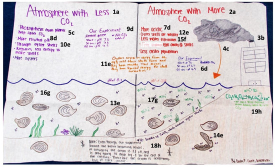 In order to successfully develop curricula and professional learning materials to align with this vision, there is a need to understand how students develop models through iterative revisions in the reality of science classrooms [16]. Authentic classroom environments can be a platform for showing challenges to the implementation of research-based ideas. In addition, the unique background of students can help researchers to identify diverse ways of student participation in the construction of knowledge through modeling practice. To this end, we worked with 14 classes where students engaged in constructing explanatory models. Explanatory models are tools that provide students opportunities to communicate their initial conceptions and integrate and revise these ideas with evidence collected through investigations, observations, and credible resources to gain explanatory power. These models can include inscriptional and written discourses to explain how and why phenomena occur [17,18]. The explanatory models were a critical part of a module on the impacts of climate change, and students worked to develop models that explained the impact of increasing atmospheric carbon dioxide on oyster larvae.