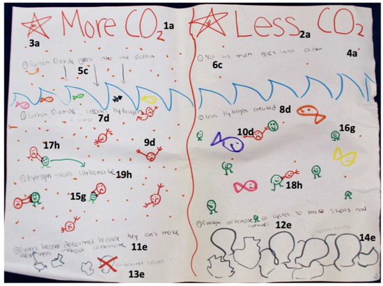 Figure 5 is an example of an explanatory model that illustrates a ‘Partial’ explanation. Similarly to the previous examples, the model portrays two sections with different CO2 amounts in the atmosphere. The title of each side shows the key idea of ‘CO2 Amounts’ (1a and 2a). The left side (more CO2) demonstrates the students’ attention to the key idea of the ‘Source of CO2’ via drawings of a factory (3b), a house (4b), and a car (5b) emitting CO2. On the right side (less CO2), the students share the same key idea by showing means of transportation that will reduce the CO2 amount, such as drawings of a bike (6b) or a person running (7b). To attend to the way CO2 amounts connect with the key idea of ‘pH and Acidification’, the students equated more CO2 to a low pH environment (left side, 8d), while the side with less CO2 (right side) is shown as being equal to a higher pH environment (9d). The students used several modalities to communicate the key idea of ‘Energy Expenditure in Shell Building’. Using the ‘Written’ modality, the students explained the relationship between levels of acidity and the damage to oysters’ shells (10e, 11e). The students used the ‘Drawn’ modality (with a label) to illustrate several dead (i.e., open) oysters on the “more CO2” (left side, 13e) and drew only live (closed) oysters on the “less CO2” (right side, 14e). The drawn images of the oysters were disconnected from other key ideas. For example, it is not clear what caused the death of the oyster labeled “dead one”. The students presented the key idea of ‘Oysters Filter Water’ by writing “dirty water”, or “clearer water” and connected it to the idea that water is filtered by organisms (15f, 16f). The key idea of ‘Carbonate Availability’ was partially addressed by describing, in writing, the relationship between CO2 levels, the amount of hydrogen, and the amount of carbonate (18g, 19g), but was missing information about the link between hydrogen ions and acidification. The model lacks two key ideas that are critical for a cohesive explanation, those being the ‘Carbon Cycle’ and ‘Chemistry of Shell Building’. For example, while the model attempts to address the key idea of ‘Energy Expenditure in Shell Building’, it fails to explicitly address that oyster larvae struggle to grow shells in more acidic environments. In addition, the model missed the important connection outlining how the carbonate level is affecting oyster larval development. We coded this model as ‘Partial’ due to the lack of several key ideas coupled with a lack of critical connections among the key ideas that were included.