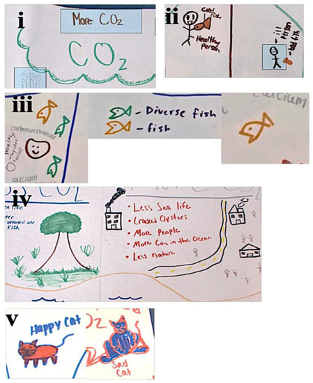 Thirteen student models communicated the impacts of changes in atmospheric CO2 on land plants (9%) and five student models drew non-human land animals (3%). For example, one model showed a green tree and bushes on the side of the model where there is less CO2 and a less acidified ocean (Figure 7iv, left side), and on the side of that same model that represented an atmosphere and ocean with more CO2, there were no green plants drawn and they wrote “less nature” (Figure 7iv, right side). The right side of Figure 7v demonstrates a model where students drew a sad cat who lives on land where there is more CO2 and an unhealthy ocean. That same model shows a happy cat (Figure 7v, left side) on the side of the model where there is less CO2 and a healthy ocean.