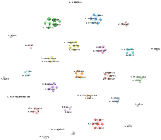 Concerning IQ1.2.2. Similarity of the papers based on citations that they share, as can be seen in Figure 5, most of the papers under review appear connected, suggesting that they share at least a core common literature. Further, in Figure 5, we can notice three main clusters. After checking the related papers, the cluster represented with green contained mainly ITS papers, where the main role of adapting and supporting the learning process was played by the system (using a pedagogical/psychological model). In these papers, teachers were also involved, usually by having access to the logic used by the model, but, in specific cases, they could even overwrite the decisions taken by the system (see, for instance, [31]). Papers with red came mainly from the field of LA. In these cases, the analyses of students’ data were guided by a pedagogical/psychological model of student learning, but teachers had to take the appropriate decision about how to intervene. The blue cluster in the middle corresponds to papers that describe cases where both teachers and intelligent systems work in tandem to support the learning process. As an example, Ref. [32] proposed a teacher dashboard that had to be used together with an ITS, aiming to help teachers to design and later orchestrate learning activities that involved the ITS.