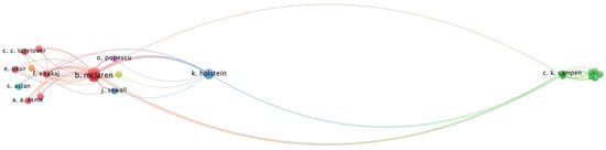 T.1.2. Bibliographic coupling. Apart from explicit collaborations between the authors (i.e., co-authoring), we also looked at networks that provided insights about potential implicit alignments among the papers under review. For instance, regarding IQ1.2.1. Co-citation among the authors, as we can notice in Figure 4, only a small number of authors have referenced each other, and they are usually the ones who tend to have co-authored together. This might suggest that the different research groups that have inquired about MbLA need to be more aware of each others’ work.