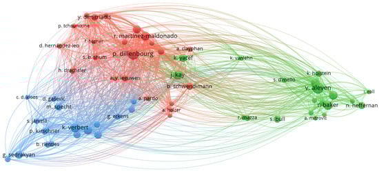 Main co-cited authors, as found in the references of the papers under review. With green, on the right side, authors connected mostly with ITS. With red and blue, on the left, authors connected mostly with LA research. The red cluster includes authors related to collaborative learning, while the blue cluster includes authors that have focused on individualistic aspects (e.g., self-regulated learning).
