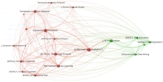 The main publishing venues co-cited by the papers under review. With green, venues targeted by the ITS community; with red, the ones targeted by LA.