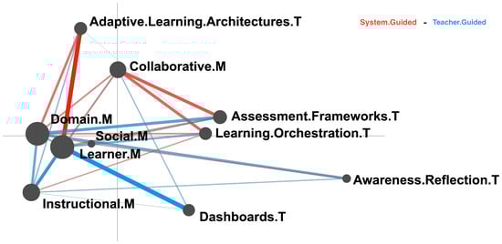 In our previous work, we classified the papers under review into two groups: those where the proposed systems played the primary role in adapting the learning process, and those where the teachers were the primary agents of adaptation (see Table A1 in Appendix A for more details). When building ENA, we created and subtracted two different networks based on these two groups of papers (respectively, with red and blue in Figure 9). It is unsurprising that the network of papers focused on system-guided learning displayed a higher level of interconnectedness between topics related to Adaptive Learning Architectures and Assessment Frameworks, or models such as domain and social models (evidenced by stronger red connections in the subtracted network in Figure 9). On the other hand, the network of papers focused on teacher-guided learning showed stronger connections between most of the models, as well as topics such as Dashboards or Awareness and Reflection (with blue in Figure 9).