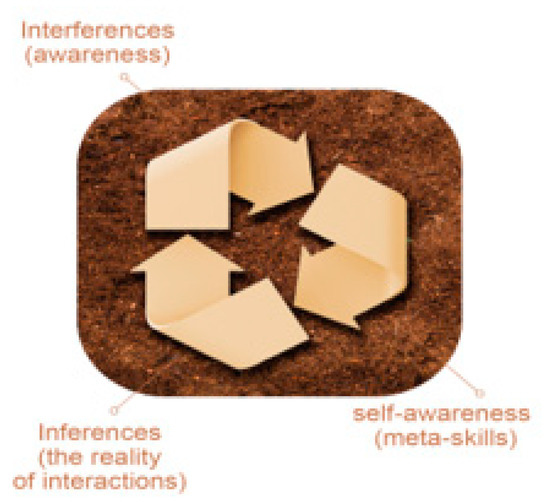 Finally, the model should be an intercultural process that is part of an ecological framework, that of recycling languages and cultural experiences [40]. Recycling is a process of treating elements so that some of their materials can be reintroduced in the production of new products. We feel this process should be part of the proposed model. Interactions, potential conflicts, and linguistic or social interferences constitute these valuable moments of the (real) encounter which will allow the taking into account, then the awareness of the elements at stake (the reflection). Then, self-awareness allows the reintroduction of these materials concerning the specificities and universals relating to languages and cultures for learning and will, in turn, generate new inferences constituting the development of “meta” competences, which we could materialize by the following diagram: