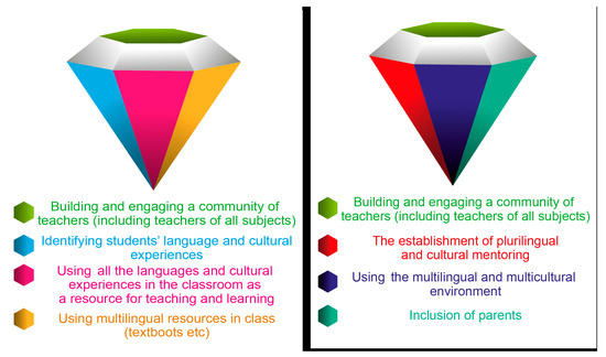 The diamond focuses on: 1. identifying the languages spoken by pupils and the cultural experiences they have had; 2. using all the languages and cultural experiences present in the classroom as a resource for teaching and learning; 3. using and creating multilingual and multicultural materials; 4. establishing mutual, reciprocal mentoring within the classroom; 5. Exploring multilingual and multicultural environments outside the classroom; 6. Using the linguistic and cultural resources of parents; 7. sensitizing the educational staff and teachers of all subjects about the plurilingual and intercultural approaches [47].