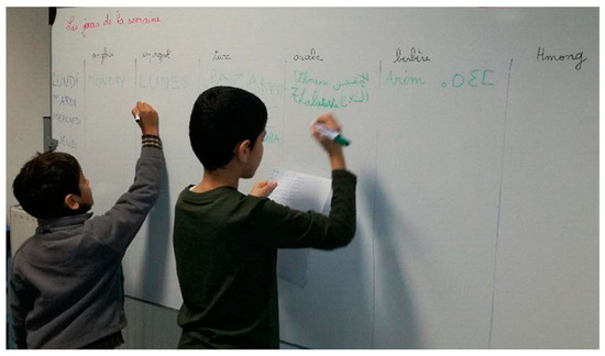 Moreover, identifying diverse languages and cultural experiences present in the classroom, and more broadly in the school, does not stop at the students’ repertoires. It is also important for teachers, and all school staff, to identify these resources, not only for ontological issues of recognition but also to know who can offer mediation, and translation according to the needs of students, teachers, or parents. Duchêne [50] explains that Geneva airport, for financial reasons, when hiring new staff always chooses those who speak so-called ‘rare’ languages to be able to mediate in case of a problem with a traveler. This interest, which is well understood by international companies, is rarely replicated by schools, which live in a multilingual context. It is therefore understandable that acknowledging the linguistic and cultural experiences of all the students makes relations easier (Bauman by Dervin [49]), as each person can be, in turn, a subject, an object, or a mediator himself, depending on the needs, desires, and proposed work activities. For example, if a pupil does not understand an activity, another pupil or an adult can translate, know what is disturbing for the pupil and offer an explanation. The pupil who needed mediation may, at other times, become a translator, mediator, or facilitator. This fluidity of roles from receiver to provider allows for mutual recognition. The value recognized for each person helps to strengthen the learning community and value the linguistic and cultural experiences of all, rather than being ignored, which would be a source of fear and devaluation.