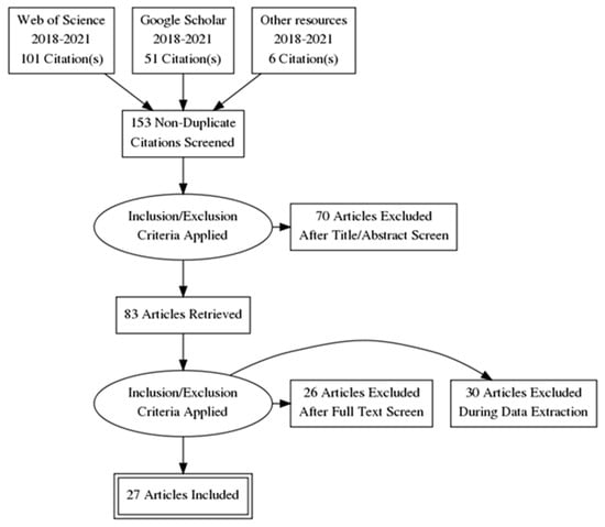 A total of 152 sources were selected using the search strategy described above, and 6 sources were added from the recently read sources (see Figure 1). Consequently, a total of 158 publications were originally obtained. The next step, according to the PRISMA settings, was to eliminate duplicates. A total of 153 publications remained after this action. Subsequently, the publications were selected according to the inclusion/exclusion criteria by carefully examining the publications by their titles and abstracts. This reduced the number of publications to 83. Afterwards, the full texts were read and the inclusion and exclusion criteria were repeated. A total of 26 publications were declared inappropriate. When the data needed for the analysis began to be obtained, a further 30 publications were discarded because digital assessment was not characterized in any way. As a result, 27 publications were included for complete analysis.