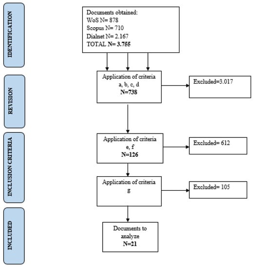 A total of 3755 results were obtained. After applying the inclusion and exclusion criteria, 3732 documents were eliminated. The final sample of studies consisted of 21 documents. The following flow chart shows the selection process and the thorough examination of the articles (see Figure 1).
