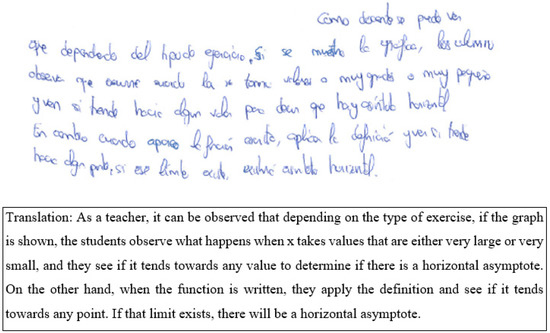 Firstly, 13 PSTs (34.2%) of 38 demonstrate an awareness of how the task’s semiotic register, in this case, graphical, influences Juan David’s strategy and reasoning, known as the problem of the first threshold [26]. For example, when PST24 (see Figure 2) says, “as a teacher, it can be observed that depending on the type of exercise…” it can be noticed that they show awareness. Other expressions used by PSTs were “observing the limit of the function visually. Since the function is given by its graph” (PST14).