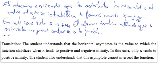 - Knowledge of the first threshold problem [26]: This variable takes the values yes or no. Yes, if the PST demonstrates an awareness of how the semiotic register of the task conditions the strategy used by the student; no, otherwise. Reasoning like “since the function is given by a graph, Juan David couldn’t use the algebraic expression of the function to find the limit as it approaches infinity. Therefore, he analyzes the behavior graphically by observing if the graph seems to stabilize around a specific value”, which would be evidence of knowledge of the first threshold problem;