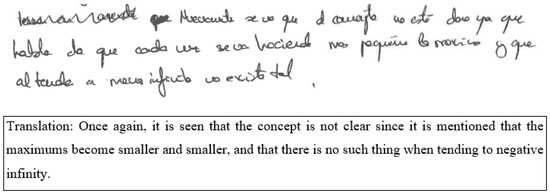 Regarding the SA, there is one conversion and one treatment from two different PSTs. The conversion described by PST16 (Figure 5) shows how he focuses on Juan David’s appreciation of the decreasing numerical value of the maximum coordinates, which is shown in the graph, and thus realizes that for the student there is no SA as the limit is negative infinity.