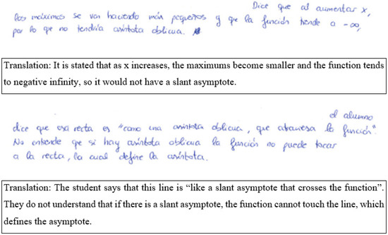 Regarding the slant asymptote, two PSTs (25%) identified some conversion, all between the graphic and numerical registers. The PSTs focus on aspects of Juan David’s reasoning such as the decrease of the ordinate values of the maxima of the graph: “he thinks that since the function is decreasing and oscillating, obviously its maxima will have more negative y-values and go to −∞” (PST25). In addition, six PSTs (75%) recognize some treatment in the dialogue: “he tries to find an slant asymptote by responding that the function doesn’t seem to approach any line” (PST15), “he understands that it cannot intersect the function and always has to have a positive slope” (PST37), among others. In both the cases of PST25 and PST37, the identified treatments focus on how the PSTs observe the graph of the function and relate it to not approaching or intersecting a line, attending to two meanings of the slant asymptote itself.