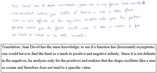 In this regard, only PST30 detected a transformation in Juan David’s exposition when reasoning about the existence of HA, specifically stating, “Juan David interprets the graph trying, even, to define it with a formula (sine or cosine) and with the graph and the limit definition, concludes that there is no horizontal asymptote”. It is, therefore, a conversion between the graphic and symbolic registers, as he observes that the student tries to resort to an algebraic expression linked to the graph that allows him to calculate a limit.