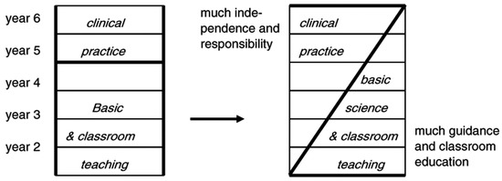 6]. Regardless of the definition, vertical integration (unlike horizontal integration) means integration across time—the time spent on classroom education gradually decreases across the four years of medical school, while the time spent in clinical practice increases, along with a blending of the solution of clinical problems with continuously teaching of basic science. Thus, the traditional 2 + 2 curriculum is being replaced with an innovative Z-shaped curriculum, where the traditional basic sciences are taught simultaneously with clinical cases [