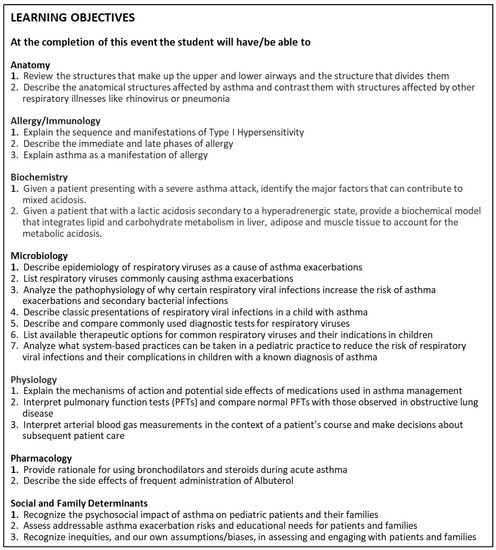 Supplementary File S1) was that of an eight-year-old boy with asthma who is seen in the emergency department and, while being treated with bronchodilators and steroids, later develops hypotension. The case was structured to meet learning objectives in the following domains: Anatomy, Allergy/Immunology, Biochemistry, Microbiology, Pharmacology, Physiology, and Social and Family Determinants (see