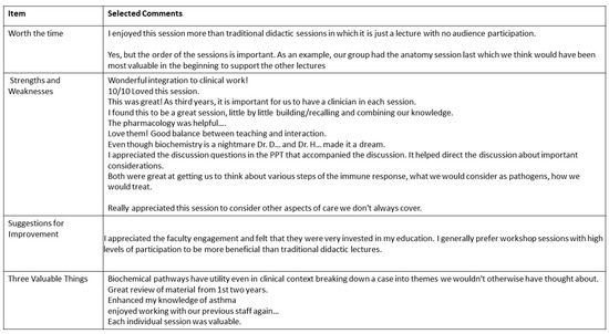 The majority of the students enjoyed meeting again the year one and two faculty. The discussion of basic science concepts in proximity to reviewing clinical management enabled the students to better understand the various facets of the case, including pulmonary physiology, biochemistry of blood gases, effects of medications on lung function and on blood chemistry, which viruses and bacteria initiate the cascade of respiratory deterioration in asthma, and the immunological aspects of the disease.