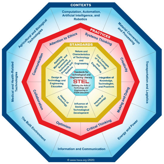 3]. The outermost octagon represents the range of contexts in which students can potentially apply T&E concepts and practices. The STEL specifies that these eight context areas are not all-inclusive but allow teachers flexibility in addressing the standards relative to their students, region, and community [