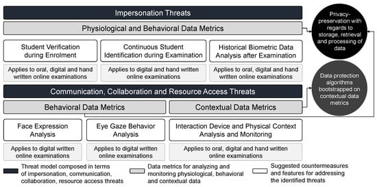 | Countermeasure #4: Monitor student’s digital context; Countermeasure #5: Monitor the student’s behavior within the physical context; Feature #10: Keyboard keystroke and computer mouse click analysis; Feature #11: Check the drivers at the operating system level of the student’s computing device; Feature #13: Face behavior and expressions analysis of the student; Feature #14: Eye gaze fixations and behavior analysis of the student | |