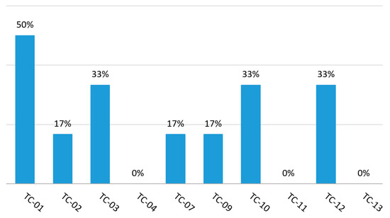 Regarding TC acquisition (Q12–Q15), students clearly recognized that the activity let them work and improve several TCs. In addition to design and project (TC-05), teamwork and leadership (TC-06), and effective communication (TC-08), other TCs were improved at the same time, as can be seen in Figure 4. According to the students’ perception, half of the students considered that the skill comprehension and integration (TC-01) was also acquired. Analysis and problem solving (TC-03), knowledge of contemporary problems (TC-10), and planning and time management (TC-12) were selected by 33% of the students, and application and practical thinking (TC-02), ethical, environmental, and professional responsibility (TC-07), and critical thinking (TC-09) by 17% of students. As a result, it can be stated that the PjBL methodology is a powerful methodological tool since it allows for working on and improving a great number of TCs.