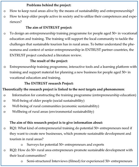 There are two research questions: (1) The first research question (RQ1): What kind of entrepreneurial training do potential 50+ entrepreneurs need if they want to create new businesses which promote sustainable development and tourism in rural areas? (2) The second research question (RQ2): How do 50+ rural area entrepreneurs promote sustainable development in their local communities?