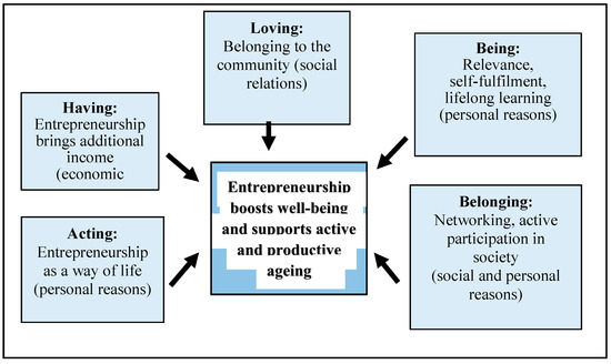 Römer-Paakkanen and Takanen-Körperich [34] studied older age women entrepreneurs and found that commitment to work and meaningful activities motivate entrepreneurs at an older age. Aging people may also have a combination of social, personal and financial reasons suitable for becoming an entrepreneur. These reasons can be grouped into five categories, as shown in Figure 2: entrepreneurship as a means of economic support (having); belonging to a community (loving); meaningfulness, self-fulfillment and lifelong learning (being); networking and active participation (belonging); and entrepreneurship as a lifestyle (acting).