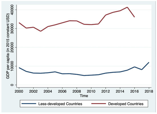 Engagement in the global economy boosts the economies of less-developed nations. The GDP per capita remained below USD 10,000 (in constant US dollars) from 2000 until 2014 and only began to break this barrier after 2016 (Figure 1) with changes in trade alliances after 2015. The post-recession global economic recovery during this period seems a more likely influential factor. There was also a slight economic uplift in the economies of the less-developed nations after 2016. From this data, it is not possible to conclude that changes in trade alliances were a cause of these temporal changes; this is an issue that merits further study.