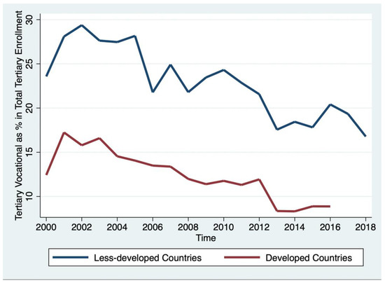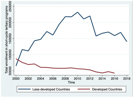 Patterns of public investment in higher education differ between and within countries. Many countries have prioritized vocational training in their national policies [1]. Many European Union (EU) countries have focused on STEM preparation in secondary schools and STEM fields in universities [2]. Enrollment in short-cycle tertiary education programs has decreased or fluctuated in the past two decades [3]. According to the International Standard Classification of Education (ISCED) developed by the United Nations Educational, Scientific and Cultural Organization (UNESCO), short-cycle tertiary education, or ISCED Level 5, refers to those programs below bachelor’s or equivalent level that are practically based, occupationally-specific, at least two years long, and prepare students to enter the labor market (please refer to Appendix A for a detailed definition) [4]. For example, short-cycle tertiary education in the United States is mainly offered through two-year community and technical colleges as associate bachelor’s degree programs [4]. For analytical purposes, this paper adopts the classification developed by the United Nations [5] and groups the countries of the world into two broad categories: developed countries (or economies) and less-developed countries (those not listed as developed countries, including economies in transition, developing economies, and the least developed economies).
