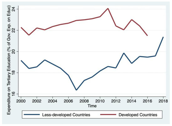 After a brief decline, public investment in tertiary education as a percent of government expenditure on education increased as a priority in less-developed countries. At the same time, it was unstable in developed countries (Figure 5). Before 2016, developed countries spent a substantially higher percentage of total government expenditure on tertiary education than less-developed countries. The less-developed nations made a substantial new investment in tertiary education after 2007, especially after 2018, when it appeared nearly equal to the investment by developed nations (Figure 5). This increased spending on tertiary education in less-developed countries could be an artifact of four-year tertiary institutions taking on a more substantial role in technical and vocational education, similar to the changes in European higher education discussed in Section 2 above.