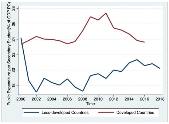 Except for 2000, a year outside the trend, the less-developed nations invested a substantially lower share of expenditure on secondary education per student than developed nations. After constrained expenditure on secondary education during 2000–2005, developed countries increased the percentage of government expenditure on secondary education per student between 2006 and 2011; spending declined to the level of the early 2000s (Figure 6) in terms of public spending on secondary education across these less-developed nations over this period. In 2000, less-developed nations spent a higher percentage than the developed nations in this study. After a drop in 2002, this percentage rose again in less-developed nations after 2008.