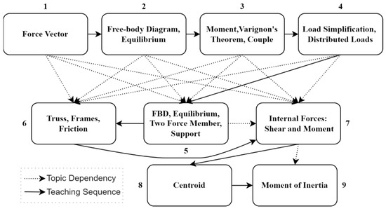 The in-course topic relations and their interdependencies (Figure 1) are natural given the roles of the preceding topics in Statics. The first four topics in Figure 1 help students develop reasoning and logical skills related to physical systems, interpret the interactions between forces and bodies, and apply mathematical operations [24,25,26]. These skills are then used in the subsequent knowledge development in topics five to seven, where they are studied in actual engineering systems. A strong understanding of the previous topics is needed to comprehend topics eight and nine, which prepare students to analyze and design cross sections in accordance with anticipated forces for structural elements to resist, a concept that is eventually covered in a future course.