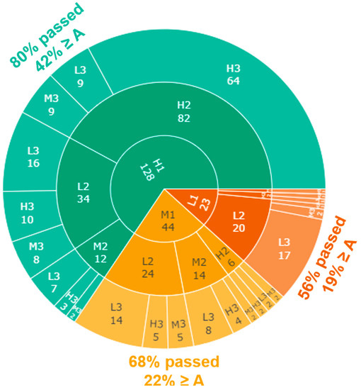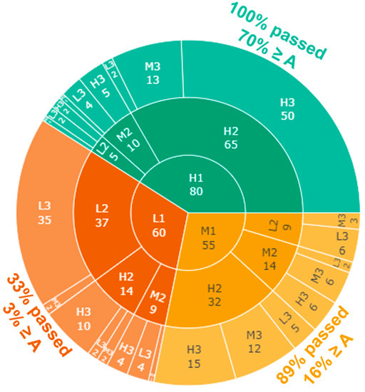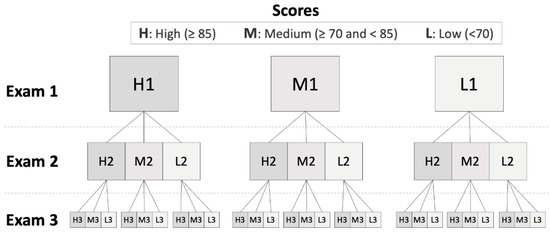 Figure 4 illustrates the exam-wise performance progression of all the students, where the inner, middle, and outer circles correspond to exam 1, exam 2, and exam 3, respectively. The categories within the circles correspond to the number of students that obtained High (H), Medium (M), and Low (L) scores for each exam.