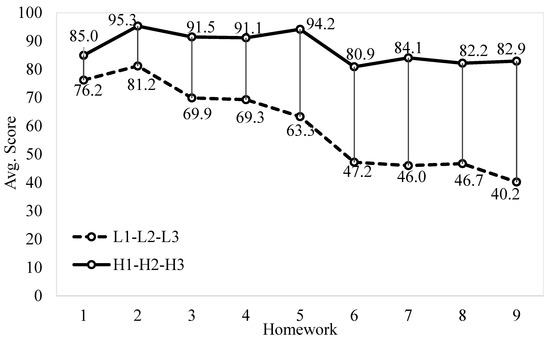 Homework performance progression of L1-L2-L3 and H1-H2-H3 students.