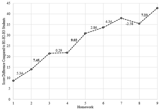 Similar to the previous section, we expanded the analysis of homework performance progression by examining the gaps in scores between high performing and continuously low performing students. Figure 9 presents the results of this analysis. Significant drops in performance are found from homework 2 to homework 3 and from homework 4 to homework 5. Moreover, the transition from homework 7 to homework 8 is the only point that exhibits a slight improvement in score differences; however, the improvement is minimal and the score is still poor at 46.7.