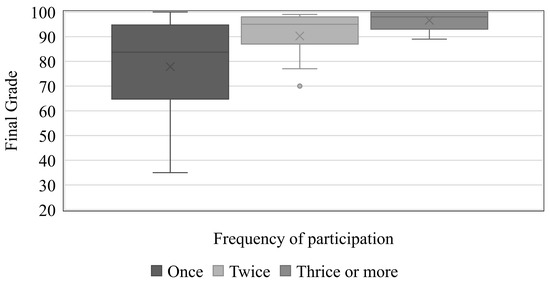 During the course period, the instructor offered extra problem-solving activities after several lectures as an incentive for students to enhance their learning. Participation in this activity was of one’s own volition, and accomplishing it effectively leads to the acquisition of enhanced knowledge. Notably, the proficient execution of the task engenders learning, independent of the motivational factors at play. A total of 46 students participated in the bonus problem-solving activity, with 24 participating once, 11 participating twice, and 11 participating three times or more. Figure 10 presents the distribution of final grades based on the number of times a student participated. The average final grade of the students who participated once was 77.87, with a median of 83.7. Students who participated twice had an average final grade of 90.27, with 54.5% receiving a final grade over 90. Students who participated three or more times achieved an average final grade of 96.63, which translates to an ‘A’ in the traditional grading scheme. Figure 10 also shows that the variability in the final grade decreases as the frequency of participation increases, indicating high reliability in high performance. Although students who participated once could still get a low final grade, participating more than once was significantly associated with achieving higher grades. Overall, the data suggests that the frequency of student participation has a significant effect on their final grade.