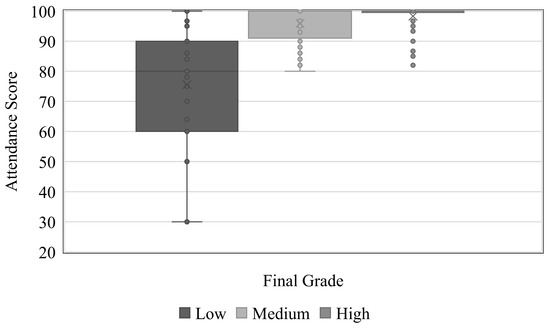 The course consisted of 29 to 30 lectures, depending on the number of holidays in a semester. Student attendance is a direct reflection of student participation and an indirect reflection of punctual learning, which is important for progressive learning in which subsequent lectures build on one another. Given this, participation by a means of student attendance is measured and presented with regard to the three-student performance groups (i.e., low, medium and high).
