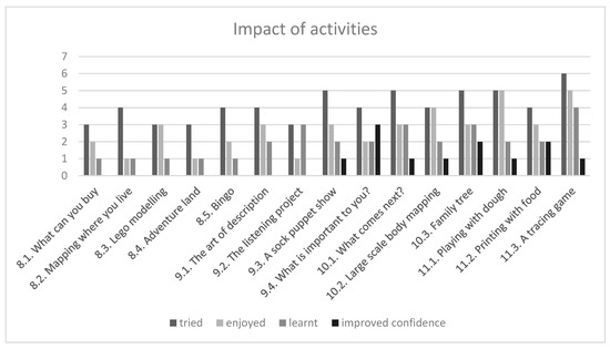 Whilst we encouraged families to choose only those activities they were interested in, within the participant group, all of the activities on the pdf cards were tried, and they provided a learning opportunity as summarised in Figure 1 below. Notably, none of the three additional activities for supporting physical development, which were available only on the website, were tried, despite parents stating that it was easier to access the website materials than pdfs. Feedback from two of the six parents highlighted an interest in accessing printed activity cards that they could easily return to in the future. This is a point of note for future cycles of this project if we are to ensure that the resources are made accessible for all.