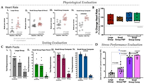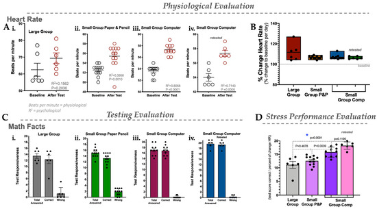 Physiological, testing, and stress performance evaluation in Subject 3. (A) Heart rate in settings: large group (i), small group using paper and pencil (ii), small group using a computer (iii), and retesting of the small group using a computer (iv). (B) Percent change in heart rate for large group, small group P&P, small group using a computer, and retesting of the small group using a computer. (C) Testing evaluation for total answered, correctly answered, and answered incorrectly (wrong) in the large group setting (i), small group P&P (ii), small group using a computer (iii), and retesting of the small group using a computer (iv). (D) Stress performance evaluation (SPE) for large group, small group P&P, and small group computer. N = 6–10; statistics were measured via Student’s t-test or ANOVA, *, p < 0.05 was considered statistically significant.