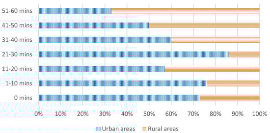 The organisation serves over fifteen million people with piped water compared to the five hundred people it used to serve in 1990 []. Data collected indicated differences between students who live in urban areas and those in rural areas to access their source as shown in Figure 3. It takes 1 h and 11 min on average for citizens in rural areas to fetch water for home use, compared to 49 min in urban areas [].