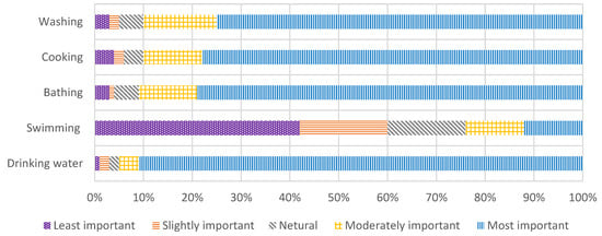 Domestic water use can be divided into two types: (i) indoor and (ii) outdoor water activities [,]. The indoor activities include drinking water, washing clothes, cooking, and showering, and the outdoor activities include washing cars and agriculture. Using a Likert scale, students were asked to rate the activities which are most important and least important for their own water use. According to the data collected, most of the students responded to drinking water as the most important activity for water use compared to other activities (Figure 4). Therefore, this shows the awareness students have about drinking water. However, two per cent of the students who participated in the survey responded to drinking water as a less important activity, which shows the inadequate awareness they have about the importance of drinking water.