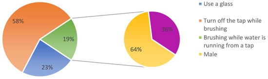 When an individual leaves the water running from a tap while brushing their teeth, they can use approximately four gallons (18 L) of water each time []. Therefore, if individuals brush their teeth twice a day as recommended by relevant organisations [,], about eight gallons (36 L) of water would be used per day, 240 gallons (1091 L) per month and 2880 gallons (13,092 L) annually would be wasted if water is left running from a tap while brushing teeth. Conservative use of water at home is therefore essential. Upon asking the students in Uganda to identify how they behave with water when brushing their teeth, most of the students acknowledged that they turn off the tap while brushing their teeth; however, there are students, as shown in Figure 5, who leave the water running from the tap while brushing their teeth.
