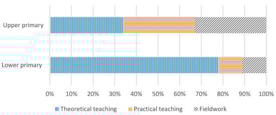 The data collected from the teachers in Ugandan schools indicates that theoretical teaching is the method that is primarily used when delivering lessons to the students at school. Of the teachers we surveyed, 45 per cent of the teachers use theoretical teaching, 37 per cent use fieldwork, and 18 per cent use practical teaching when teaching water activities in schools. The data collected from the teachers revealed that at all levels of primary and secondary school education in Uganda, theoretical teaching is mainly used compared to other methods of teaching, as shown in Figure 11 and Figure 12. Uganda’s education system is characterised by excessive theoretical teaching and less practical teaching [,]. Theoretical teaching provides students with conceptual information on a subject through structured texts and written materials. For the students, however, this information can easily be forgotten, especially when delivered through traditional teaching practices which restrict critical thinking. Students’ participation in practical activities is very important. Practical education offers hands-on learning experience and reduces the dependence placed on textbook and lecture-style delivery []. Subsequently, this enables students to actively engage with the subject matter, making the learning process more fun, memorable and effective. In one study [], the research acknowledges the benefits of this approach to learning, suggesting that students are more, likely to master a topic when they are active participants in the implementation of it. The integration of water-related topics in practical teaching can enable students to increase awareness of managing water resources. Practical teaching centred on the environment can play a significant role in influencing students’ behaviour towards the environment []. Students who actively participate in activities which are centred on water themes tend to practice the skills they have acquired within their own homes and communities. Furthermore, such methods for learning can be adapted in instances where language or education may be a barrier to more traditional learning.