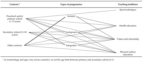 An overview of the connections between contexts (preschool and/or primary school, secondary school, and other contexts), types of programmes, and teaching traditions is presented in Figure 1.