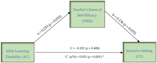 Teachers’ sense of self-efficacy mediates the relationship between mild learning disabilities and inclusive setting. * p-value is statistically significant at the 1% level of confidence (p < 0.01).