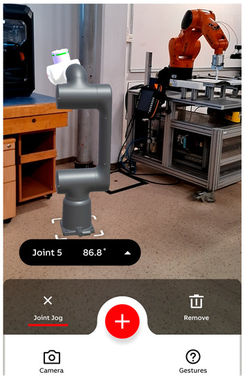 We used the AR application RobotStudio AR (Figure 5), which provides an enriched graphical experience with different industrial robots and pre-built robotic cells.