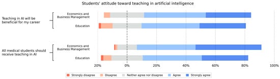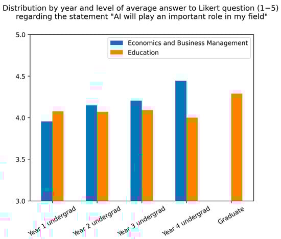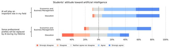 In regard to our original hypothesis, we conclude that both groups have many similarities in their attitudes, although we observe some interesting differences between them, most saliently that economics and business management students perceive a higher risk of job displacement by AI tools in their field, even higher than that observed in medicine students in previous studies. We also observe that, for education students, having received prior teaching in AI correlates to a higher level of confidence in their ability to confidently use AI tools after graduating, even though this is not the case for economics and business management students. This factor did not play as big a role as we had assumed. We also observed intra-group differences that we had not anticipated, such as the fact that students at a higher level of study present a higher perception of the importance of AI in their professional future as well as, at the same time, a lower confidence in being able to work with AI in their professions.