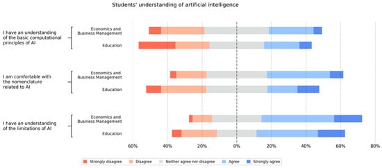 Regarding the degree of knowledge that students have about artificial intelligence, which corresponds to our second research objective, Figure 2 shows that the surveyed population is not familiar with this technology. The majority of participants, 59% of economics and business management students and 70% of education students, are not comfortable with AI concepts, as related to the statement “I am comfortable with the nomenclature related to artificial intelligence” (M_EBM = 3.27; SD_EBM = 0.95) (M_Ed = 2.99; SD_Ed = 1.13). Only 11 economics and business management students and 16 education students (11 graduate students and 5 undergraduate students) indicated high ratings regarding this question, as can be seen in Figure 3.