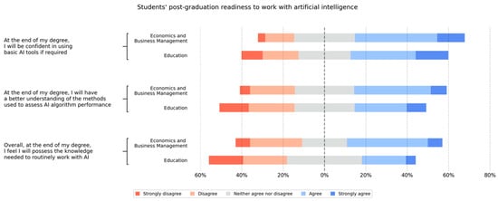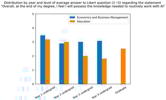 Although there are no significant differences between economics and business management students and education students regarding their perception of their AI readiness (M_EBM = 3.20; M_Ed = 3.25), there is a negative correlation with the current year of their studies for both profiles (Correlation_EBM = −0.13; Correlation_Ed = −0.36), that is to say that at higher levels, students consider that at the end of their studies they will not have a better knowledge or confidence in using AI, as can be seen in Figure 6.