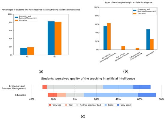 Our fourth research objective related to analyzing the teaching about AI that the students might have received. Only 17.6% of economics and business management students received any teaching in AI (Figure 7a), and 14 of them, just over half, received such teaching as part of their compulsory curriculum between 0 and 10 h; the rest were self-taught in AI. In the sample of education students, there were 25 students who received some teaching on AI (19.68%, Figure 7a); 12 of them were at the graduate level; the rest were first-year undergraduate students who received between 0 and 10 h of training in AI as a compulsory part of their studies. A total of 28% of the education students were self-taught. For all the students, the distribution of the type of training received can be seen in Figure 7b. It is of note that the majority of university training on AI was part of the students’ compulsory curriculum, and only three students received AI training as elective or extracurricular classes. The quality of the teaching in AI is perceived as generally good by the economics and business management students (M_EBM = 3.46, SD_EBM = 0.92) and by the education students (M_Ed = 3.56, SD_Ed = 1.07), which is a positive observation as a whole, although the highest frequency answer for economics and business management students qualified the teaching as “neither good nor bad” (Figure 7c).
