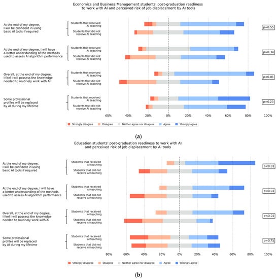In our comparative analysis of the survey results, we highlight that 85.82% of education students and 82.51% of students in economics and business management understand that AI will play an important role in their professional future, in the same range of the percentage obtained by Sit et al. [], who observed that 88% of respondents in their study on medicine students believed that AI will play an important role in healthcare in the future. However, they highlighted in their results that they found clear statistical differences in the perceived preparedness in the critical use of AI between students who had received AI teaching against those who did not, whereas this difference was not so clear in our findings, especially in economics and business management students. Furthermore, we did find that receiving training in AI did not impact the students’ perceived risk of some professional profiles in their field being replaced by AI tools. However, it must be noted that Sit et al.’s study focused heavily on the medical field of radiology and students’ being less likely to choose a career in this field due to the increasing development of AI tools for this purpose in recent years. We can speculate that students’ awareness of such clear applications of AI in their field, paired with limited knowledge about this technology and its limitations, are the most important factors in their perception of it as a threat to their profession. Students’ attitudes and knowledge about AI could also be greatly influenced by reporting in mainstream media, as previous studies have shown []. These may also be the reasons why economics and business management students show a higher perception of job displacement risk in our results, even higher than UK medical students in Sit et al.’s study.